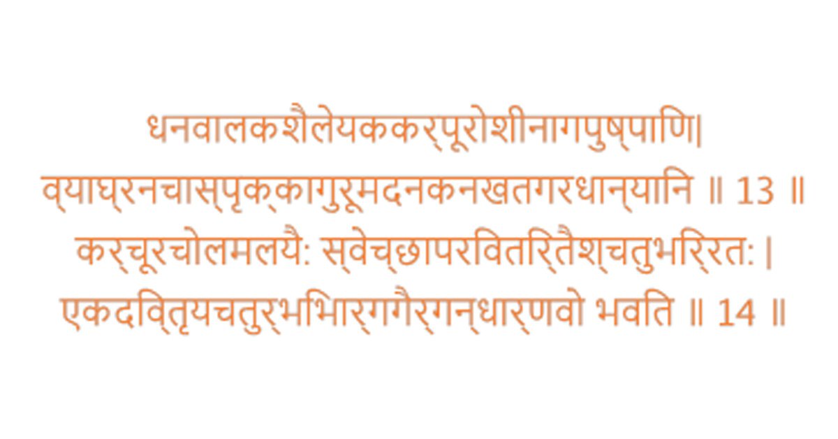 One of the disciplines in Varāhamihira’s Brhatsamhitā is how to make of perfumes known as ‘Gandhayukti’ or the art of making perfumes. Gandhayukti details several perfumeries such as scented water for bathing, scented oils for body and hair massage, perfumes, scents as mouth fresheners, deodorants and scented tooth sticks. Pertaining specifically to perfumes, shlokas 13, 14 and 29, 30 of Gandhayukti enlist the raw materials that were used to obtain perfumes in ancient India.